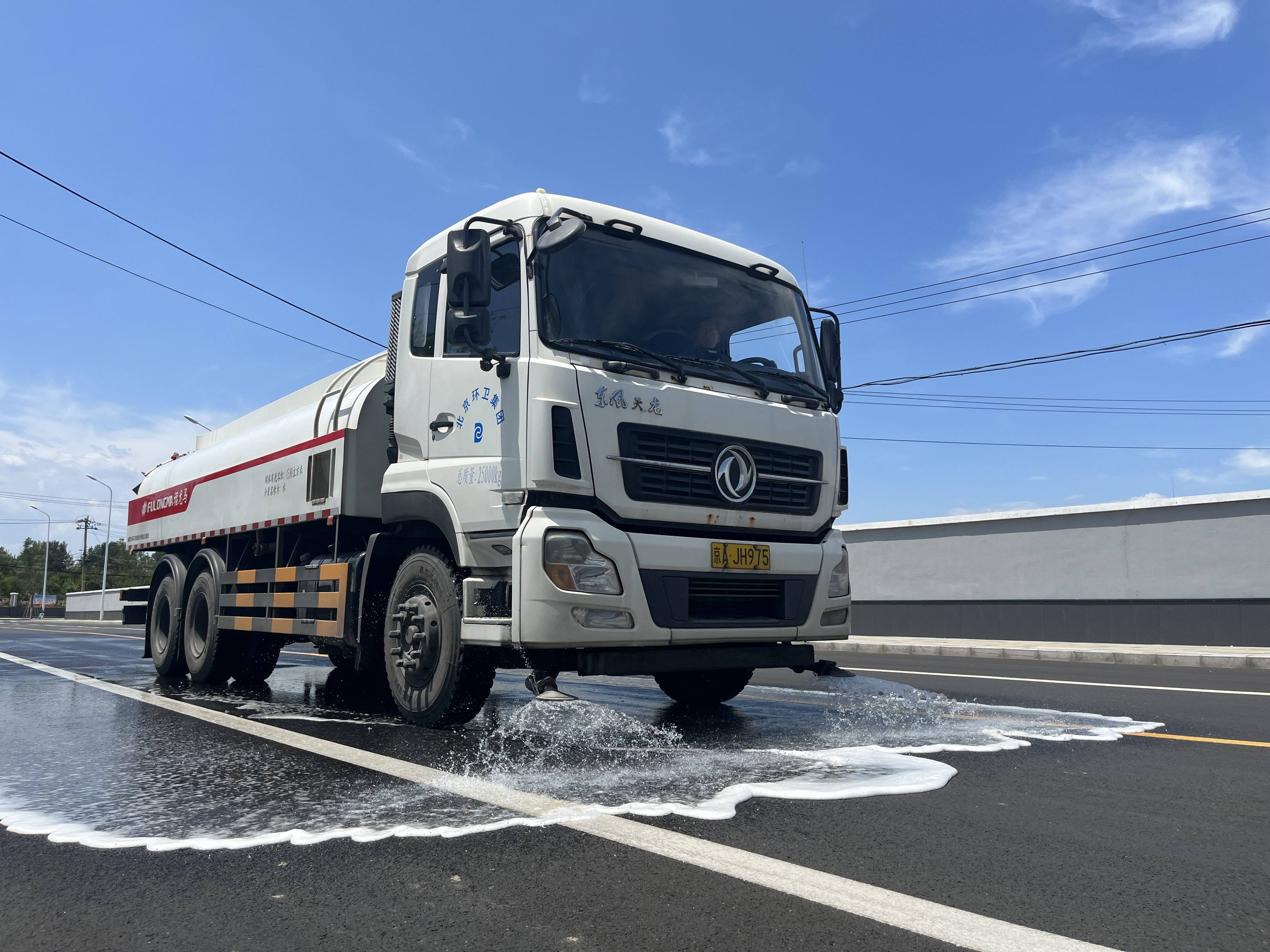 “为应对高温,我们加大了重点路段的巡回作业,现在我们增加了洒水作业频次,既可以降尘,保障环境的干净整洁,又可以缓解路面高温给人们带来的不适。”张宝民说。为达到最好的洒水作业效果,张宝民需要随时根据路面宽度及现场情况下车俯身检查调整喷口,灼热的地面烤得他头上布满细密的汗珠,本来淡蓝色的衣服,在汗水的加持下,显得更加蔚蓝。“虽然热点儿,但能给人带来清凉,即使出汗再多,也值得。”张宝民说。