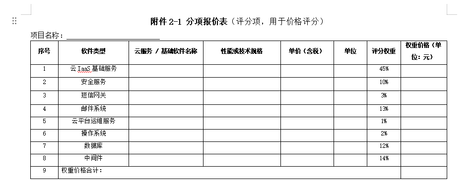 对于“火狐电竞有限公司云资源服务供应商谈判比选公告”中的“附件2-1 分项报价表(评分项,用于价格评分)”