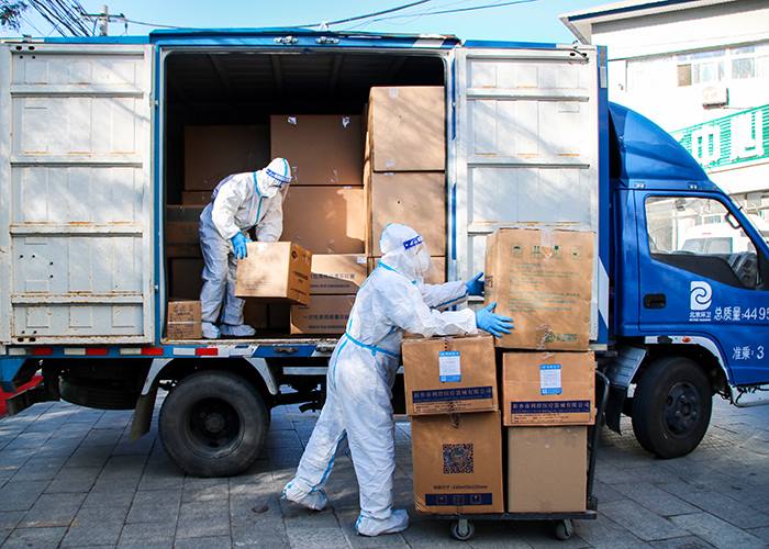 集团所属固废物流公司职工“逆行而上”,领取防护用品,准备出发清运重点管控垃圾(固废物流公司 李彦军 摄)