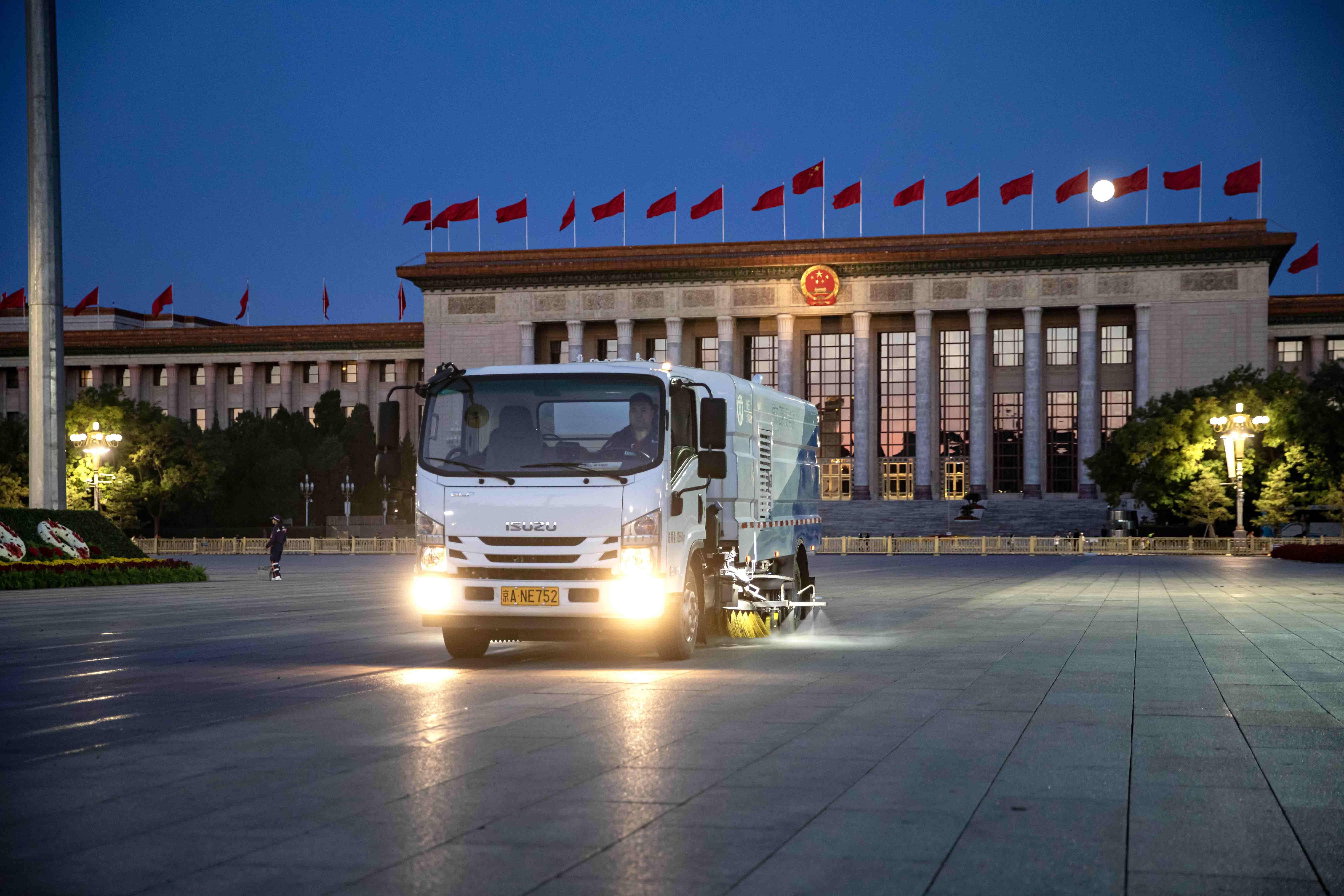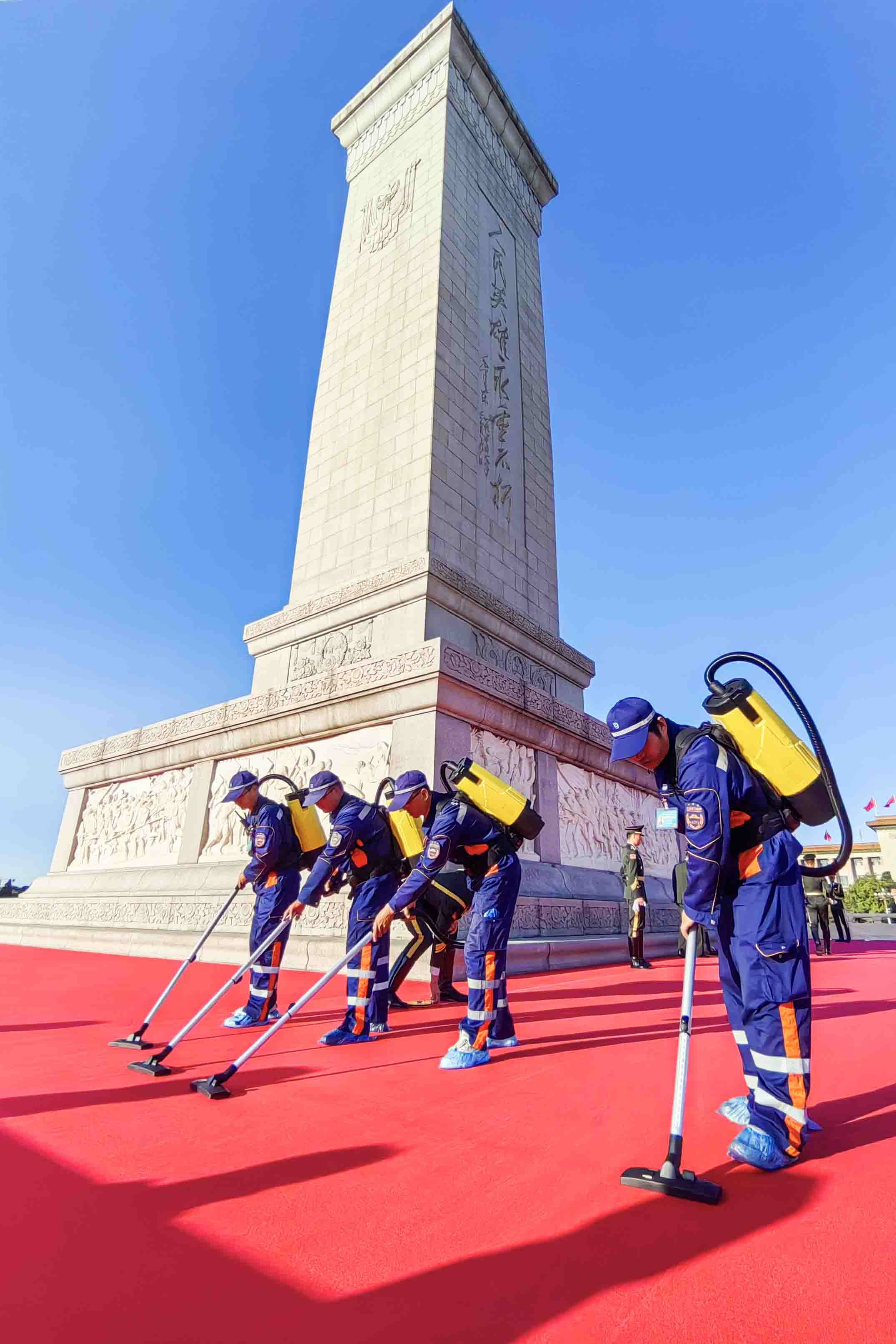 9月30日上午6时20分,随着升旗仪式的结束,现场作业人员迅速对人民英雄纪念碑周边开展清扫作业。通过机械与人工紧密配合,完成重点区域的深度保洁。7时30分,人民英雄纪念碑下的红毯清理作业开始,现场作业人员分组行动,在10分钟内完成地毯防水塑料布撤除。采取“清、扫、吸、粘、擦”组合作业工艺,在60分钟内完成红毯清理保洁。