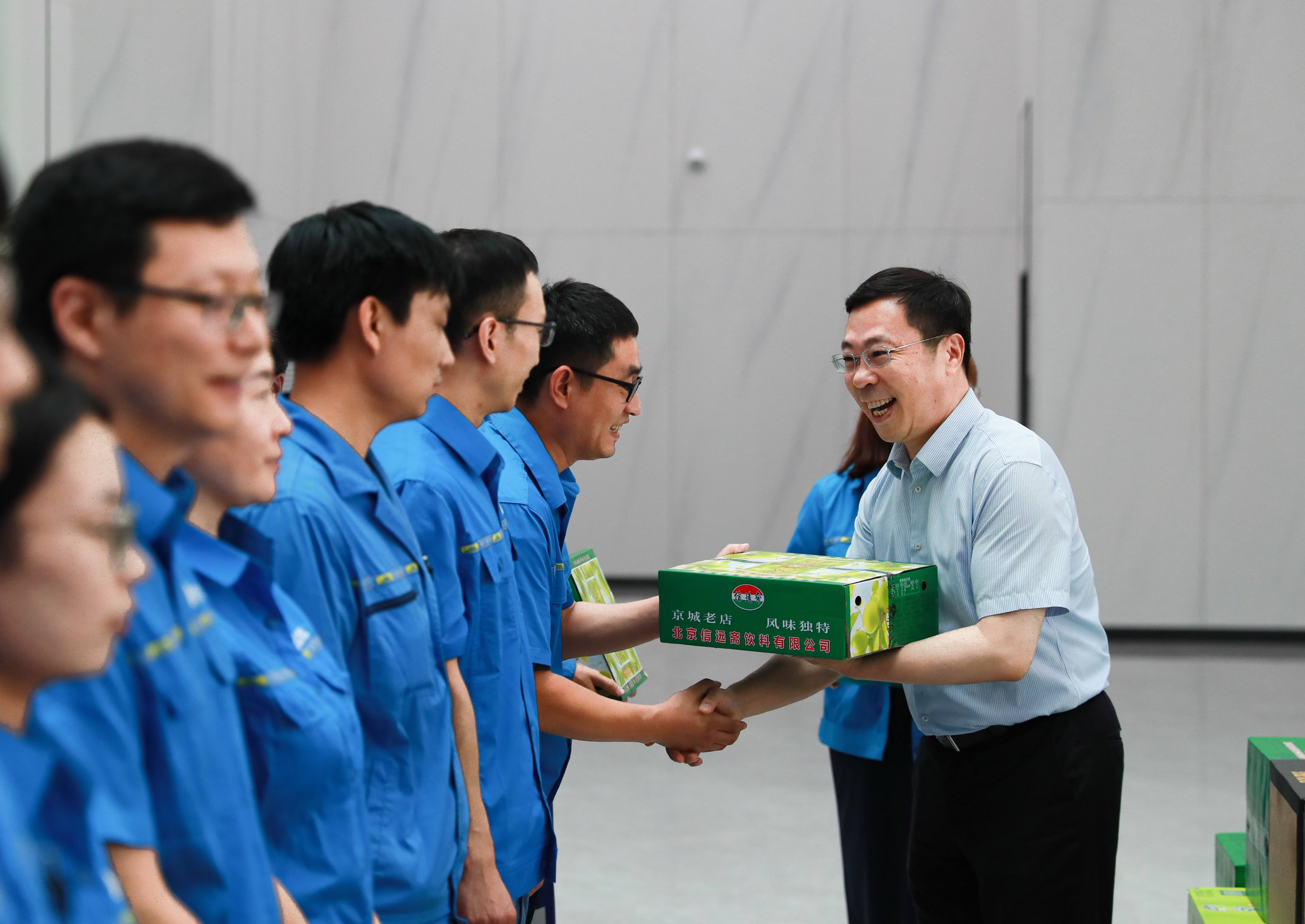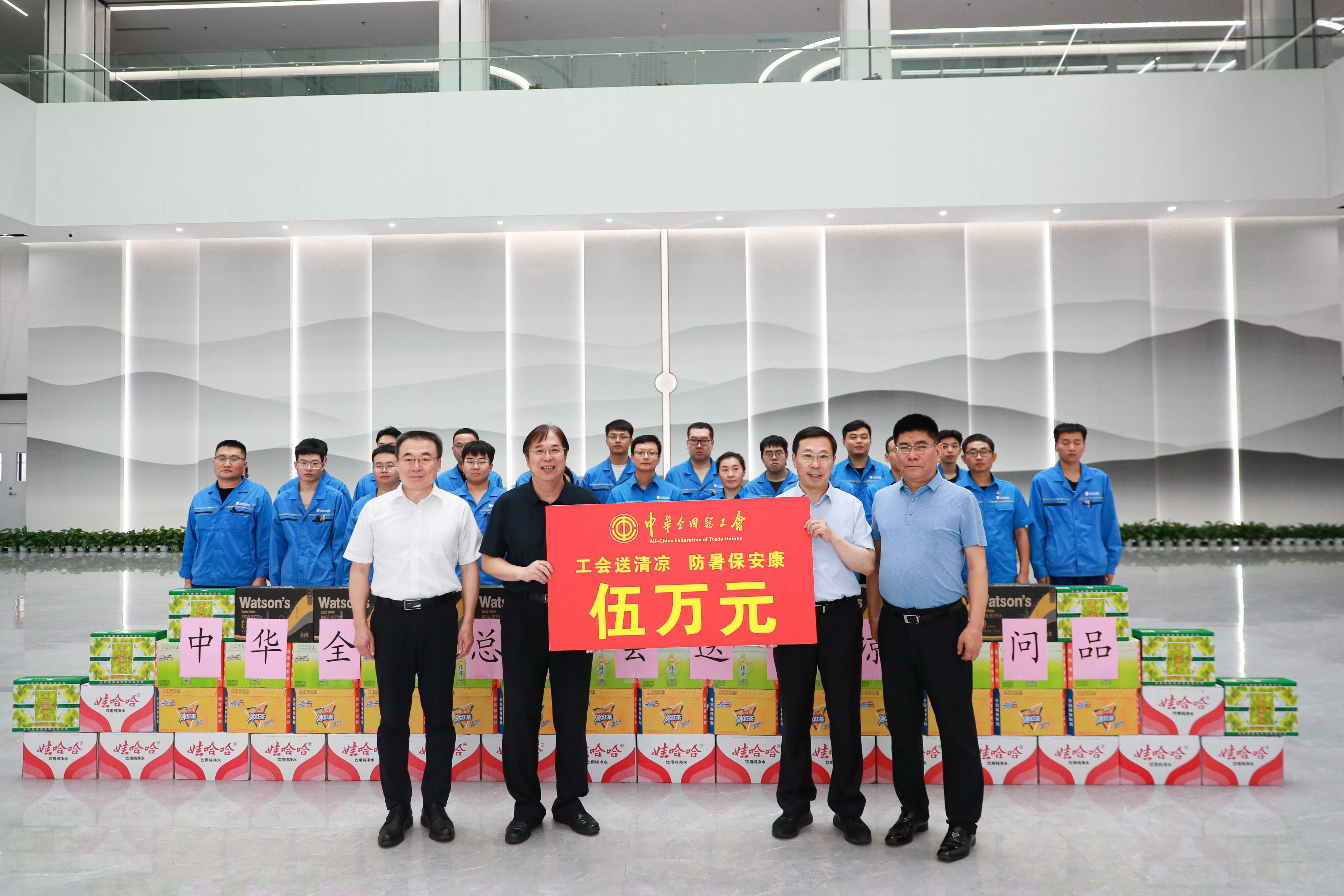 6月21日下午,中华全国总工会副主席、书记处书记、党组成员金善文带队来到火狐电竞集团安定园区分公司,开展“送清凉”活动,看望慰问一线环卫职工,并送上防暑降温物品和慰问金。中国海员建设工会全国委员会主席、分党组书记李庆忠,集团党委书记、董事长高踪阳,副总经理刘凯等陪同慰问。