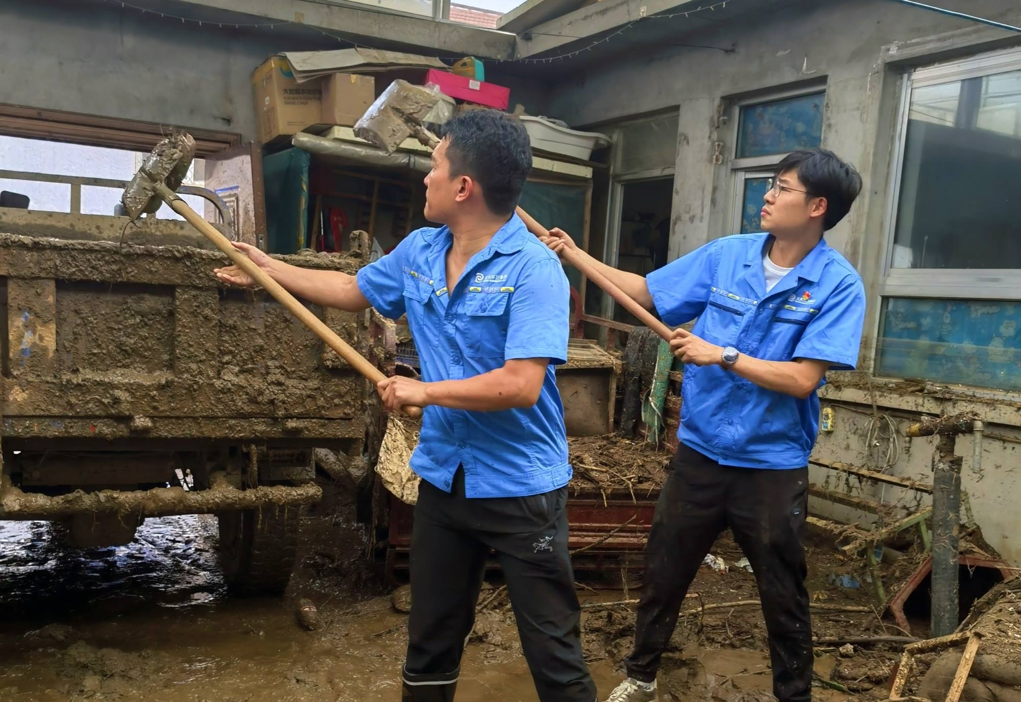 这支突击队由党员干部带头,配备高压水车与专业洗地车,开展精细化环境恢复工作。到达受灾严重的关上村后,突击队分为5组,在村委会工作人员的引导下,深入村民家中。