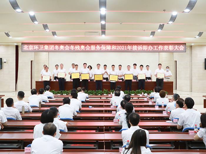 会上宣读了冬奥会冬残奥会服务保障和2021年接诉即办工作表彰决定。集团生产运营部、北京机扫公司、固废物流公司、南宫生物质公司、北火狐境河北分公司5家单位被授予冬奥会冬残奥会服务保障工作突出贡献集体荣誉称号;集团党委宣传部、监察专员办公室等16家单位被授予优秀集体荣誉称号;刘亚淘等168名同志被授予先进个人荣誉称号。北京机扫公司、通州火狐公司、固废处理公司阿苏卫填埋场3家单位被授予集团2021年接诉即办工作先进集体荣誉称号;田泽宇等7名同志被授予先进个人荣誉称号。集团领导分别为受到表彰的突出贡献集体、优秀集体和先进个人代表颁奖。